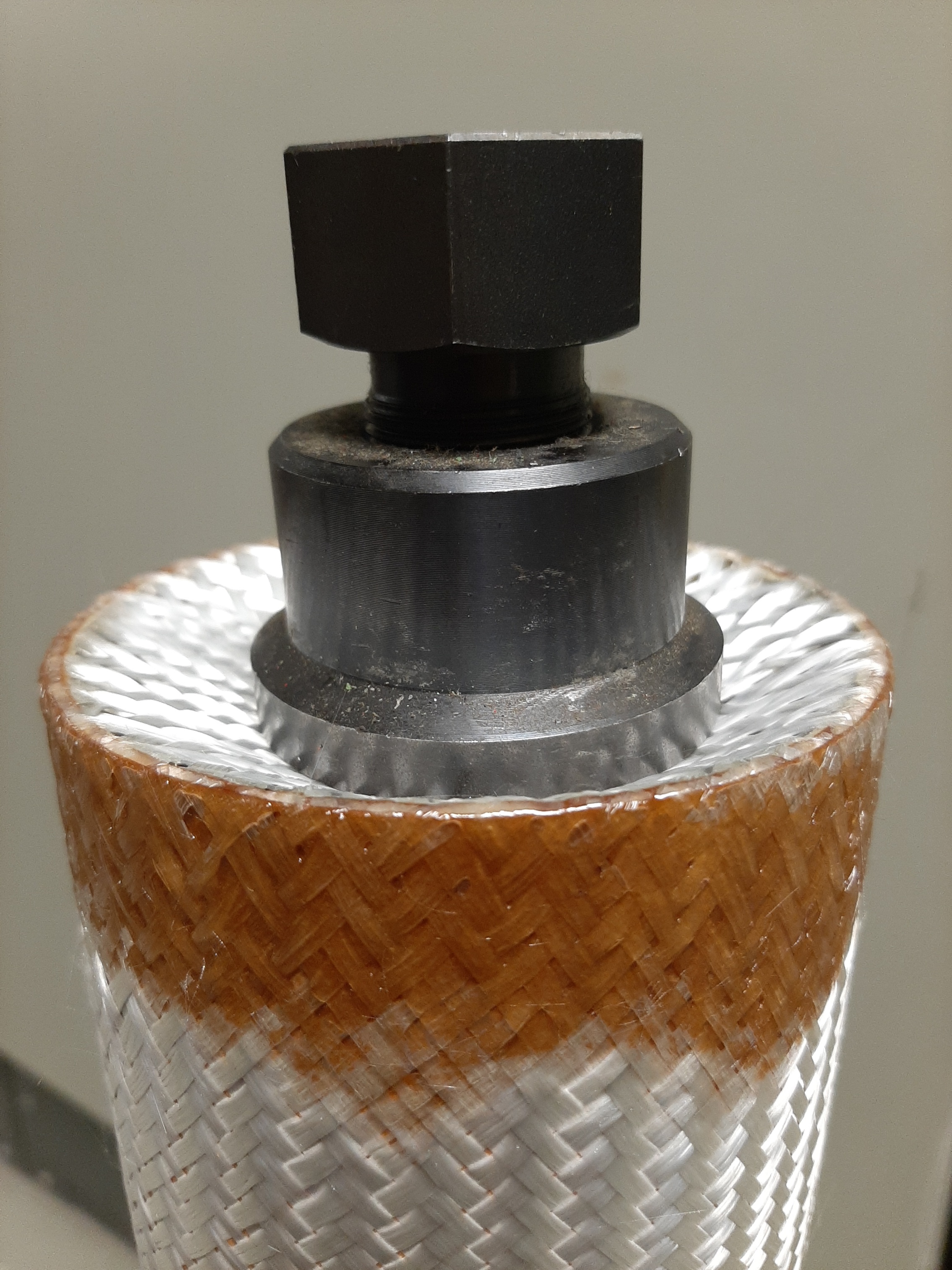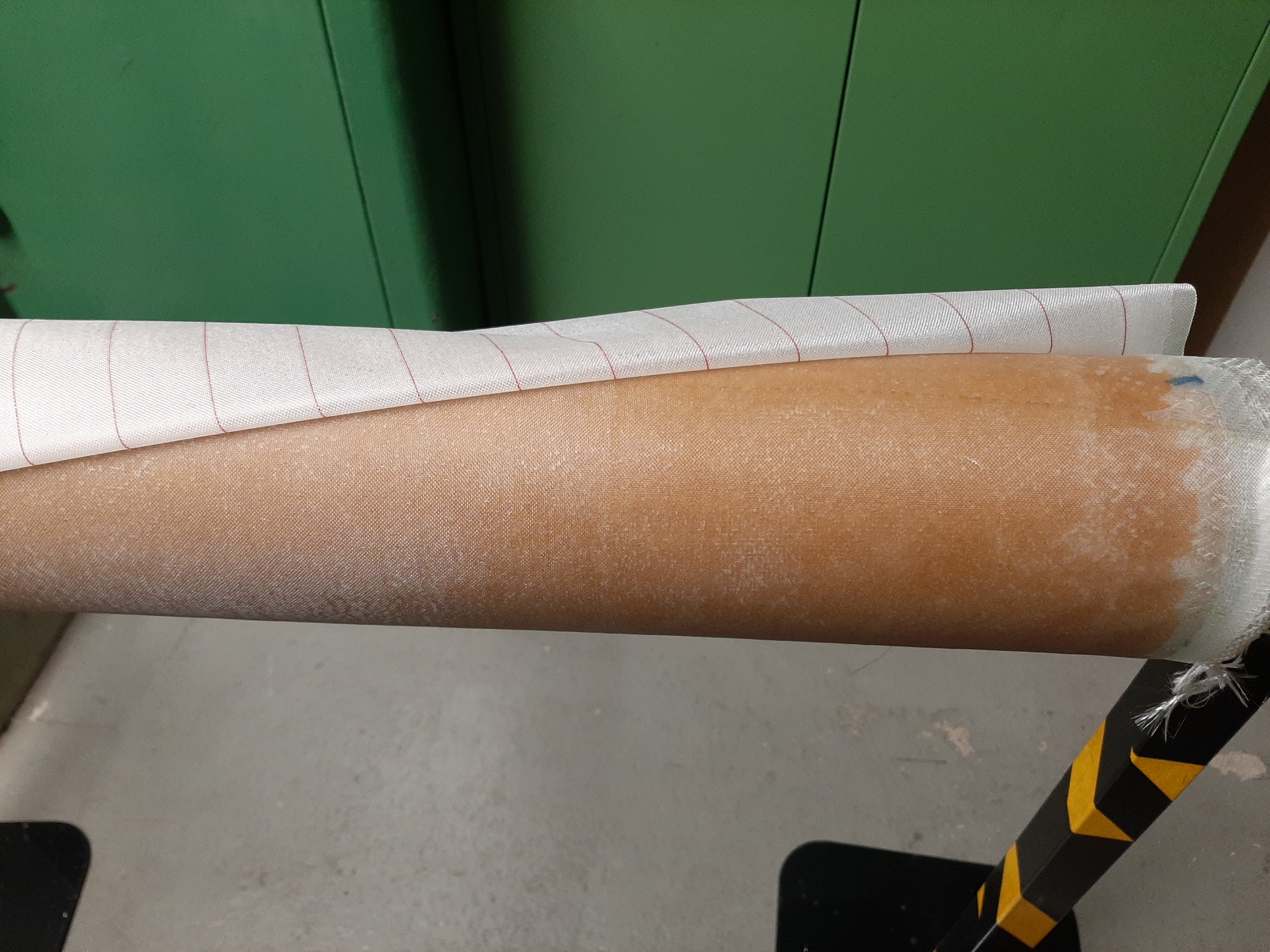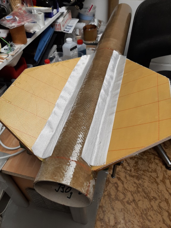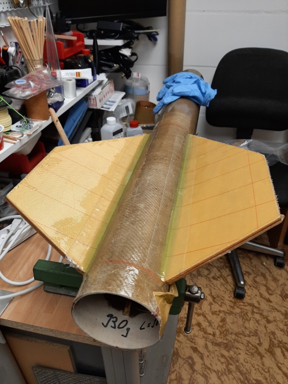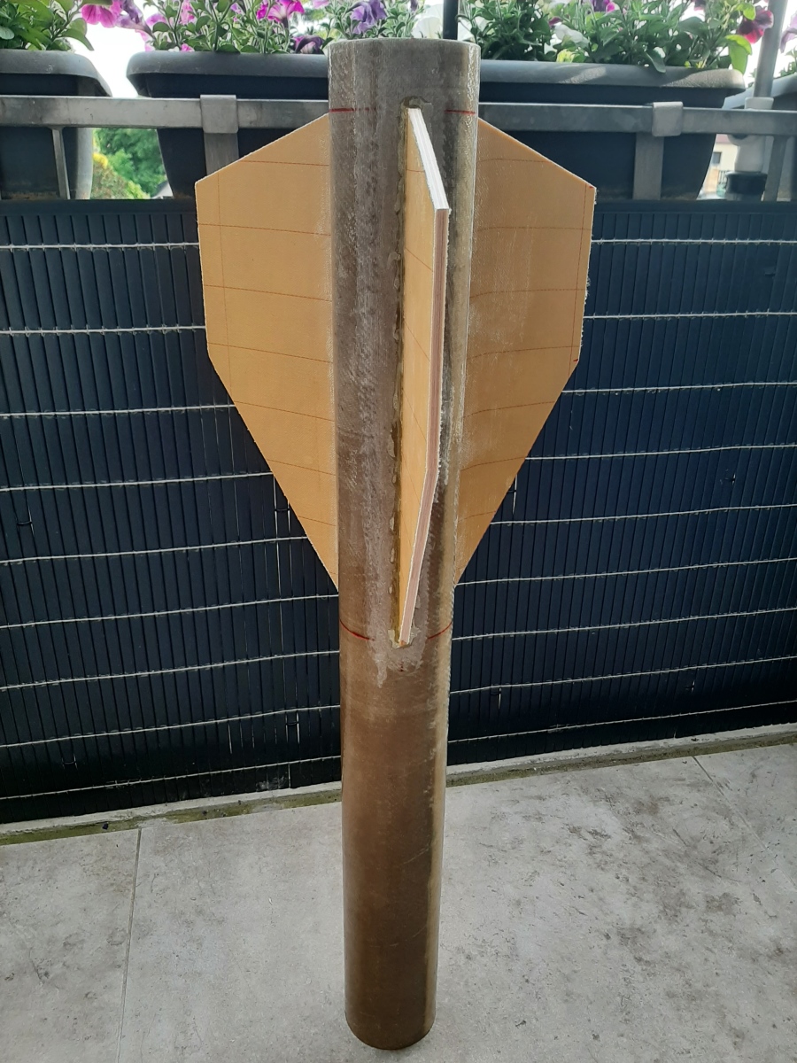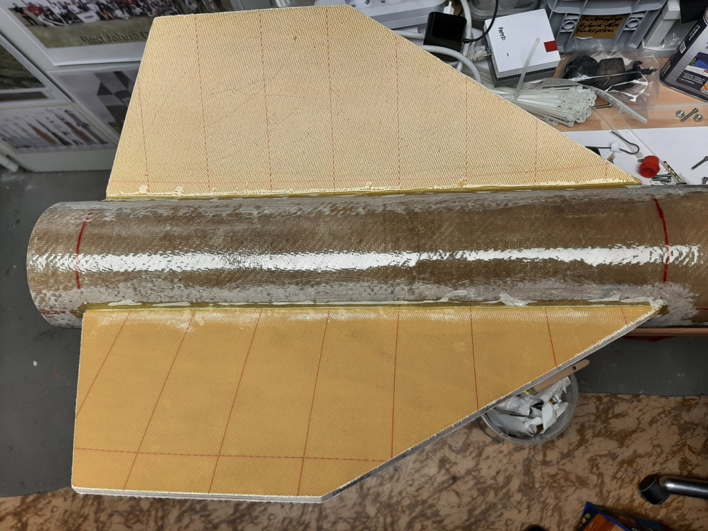 Die 8mm Sperrholzflossen habe ich beidseitig noch mit einer Lage Aramid-Gewebe belegt aber nicht weil ich bewusst noch mehr Stabilität erreichen wollte, sondern einfach weil ich das Material noch übrig hatte... Dazu muss ich sagen Aramid-Gewebe lässt sich wirklich nur sehr schwer bearbeiten, da braucht man echt eine super scharfe und robuste Schere. Die Schnittkanten lassen sich auch nicht wie GFK oder CFK schleifen weil das Gewebe nur wie ein "alter Teppichrand" ausfranst... Ich kann das Material also nicht unbedingt für unsere Anwendung empfehlen... Übrigens die roten Fäden sind nicht vom noch vorhandenen Abreißgewebe sondern sind im Aramid Grundgewebe integriert und verbleiben so auf der Fläche ! Die Oberfläche des Körperrohres glänzt übrigens so, weil ich da mal auf dem verglasten Rohr HP-Deckschichtlack getestet habe um den Sprühspachtel zu sparen... Andreas