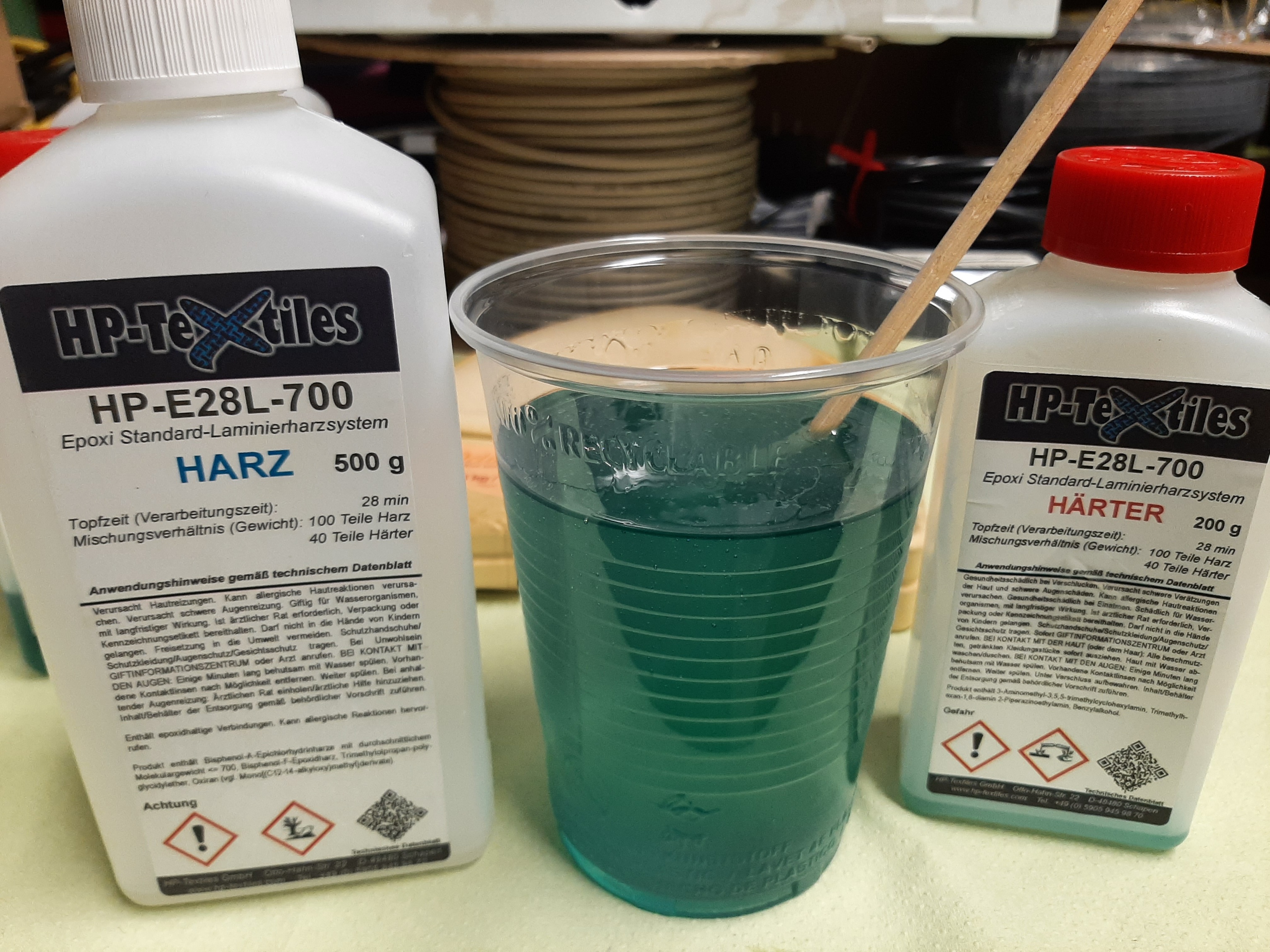 wie immer mit dem bewährten Laminierharz von HP Ganz wichtig, beim arbeiten mit Epoxidharzen immer ordentliche Handschuhe tragen, sonst drohen ganz böse Allergien ...  !!! Abreißgewebe ist die Voraussetzung für ordentliche Oberflächen...  !