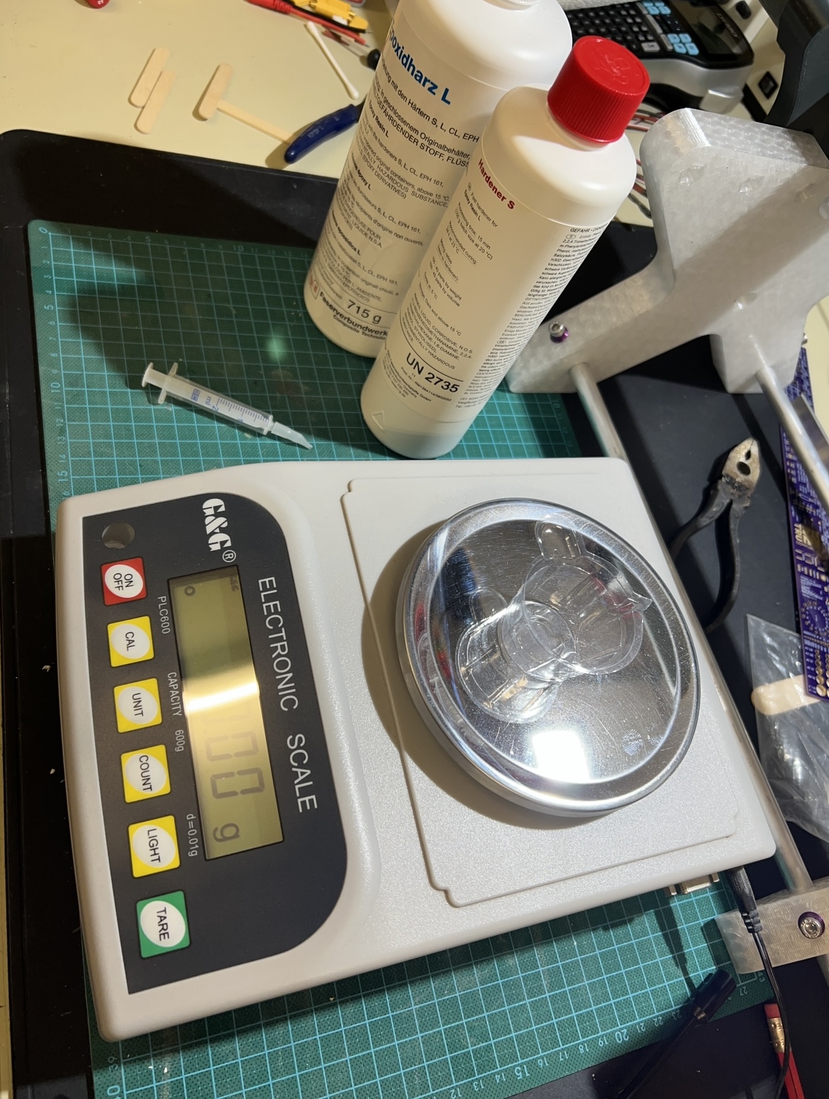 Und wieder ein wenig weiter … Das zweite set Finnen … Alle Finnen sind angeheftet … Ich hatte die Körperrohr Schlitze jeweils an einer Stelle mit dem Proxxon etwas geöffnet . Hier habe ich jetzt mit einer Spritze in jede “Kammer” ein definiertes Volumen Harz gegeben. 1ml in die großen vorne und 0,5ml in die kleinen hinten … alles mit Klebeband abgedichtet und dann sehr lange in alle Richtungen gedreht … das Harz hat sich so entlang aller innen Stosskanten gesetzt und quasi mini fillets ausgebildet .. im unteren Bild kann man gut sehen wie alles benetzt ist .. Bei der kleinen habe ich schonmal mit den außen Fillets angefangen … Heute also später geht es dann weiter . Grüße Marco