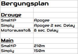Aber ansonsten ist das schon richtig so, nur finde ich 210 m schon ziemlich hoch für den Main bei einer doch recht kleinen Rakete (im Vergleich zu Raketen, die üblicherweise mit Dual Deployment geflogen werden, oder ich bin einfach schon USA-geschädigt ;-). Meine PML MiniBBX (ca. 1,5 kg leer) fliege ich mit 60 m für den Main, und für den Einstieg hätte ich vielleicht 150 und 120 m vorgeschlagen, aber das ist alles persönliche Vorliebe.