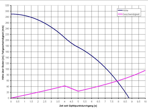 Geschwindigkeit bei Brennschluß und Ausstoß Fallschirm 20 m/s