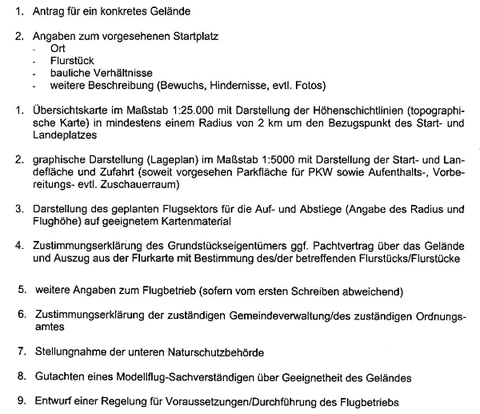 Es könne nur ein fester Platz genehmigt werden, und das auch nur wenn untenstehende Bedingungen erfüllt werden! Die max. Flughöhe darf 100 m nicht überschreiten.