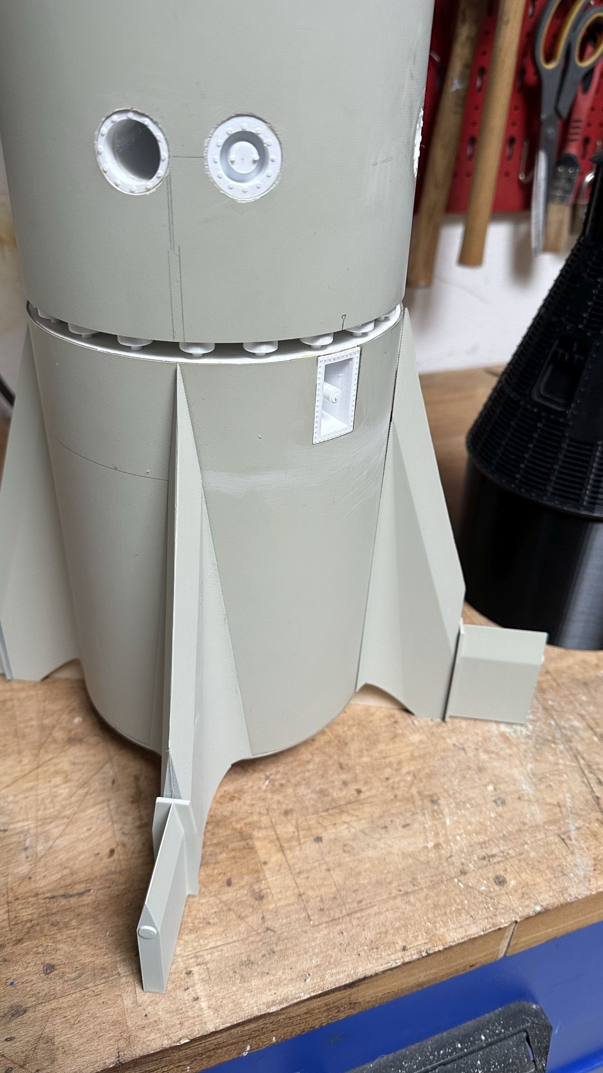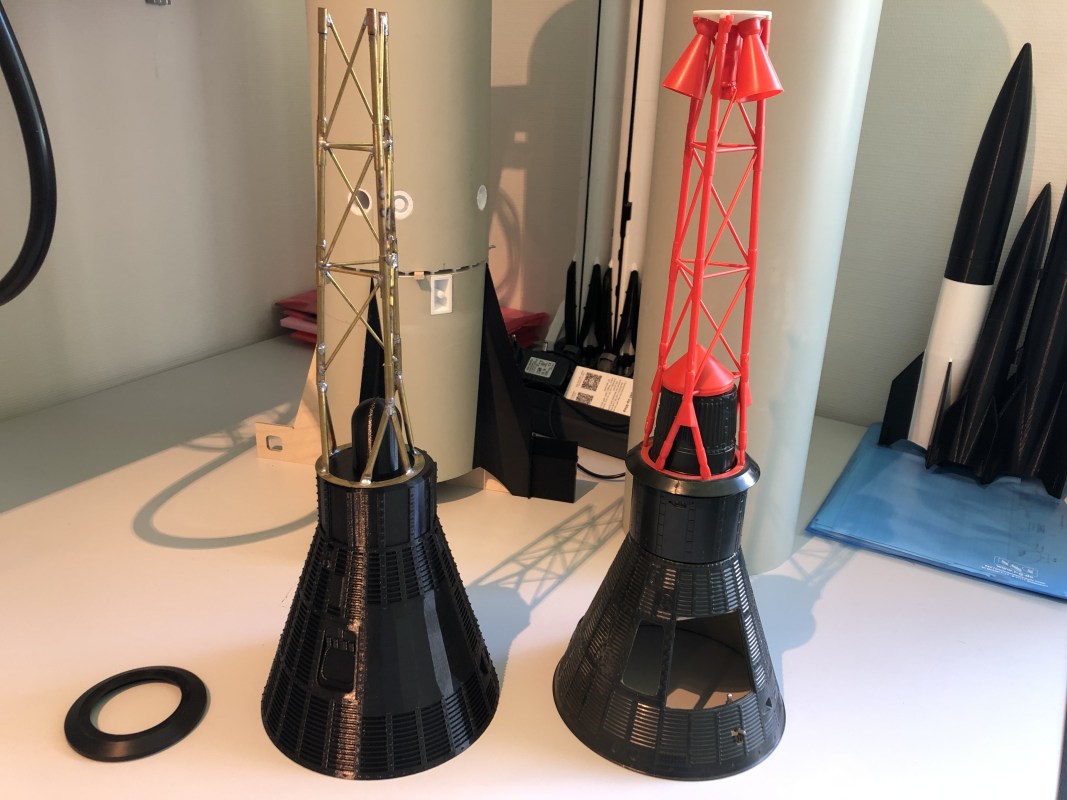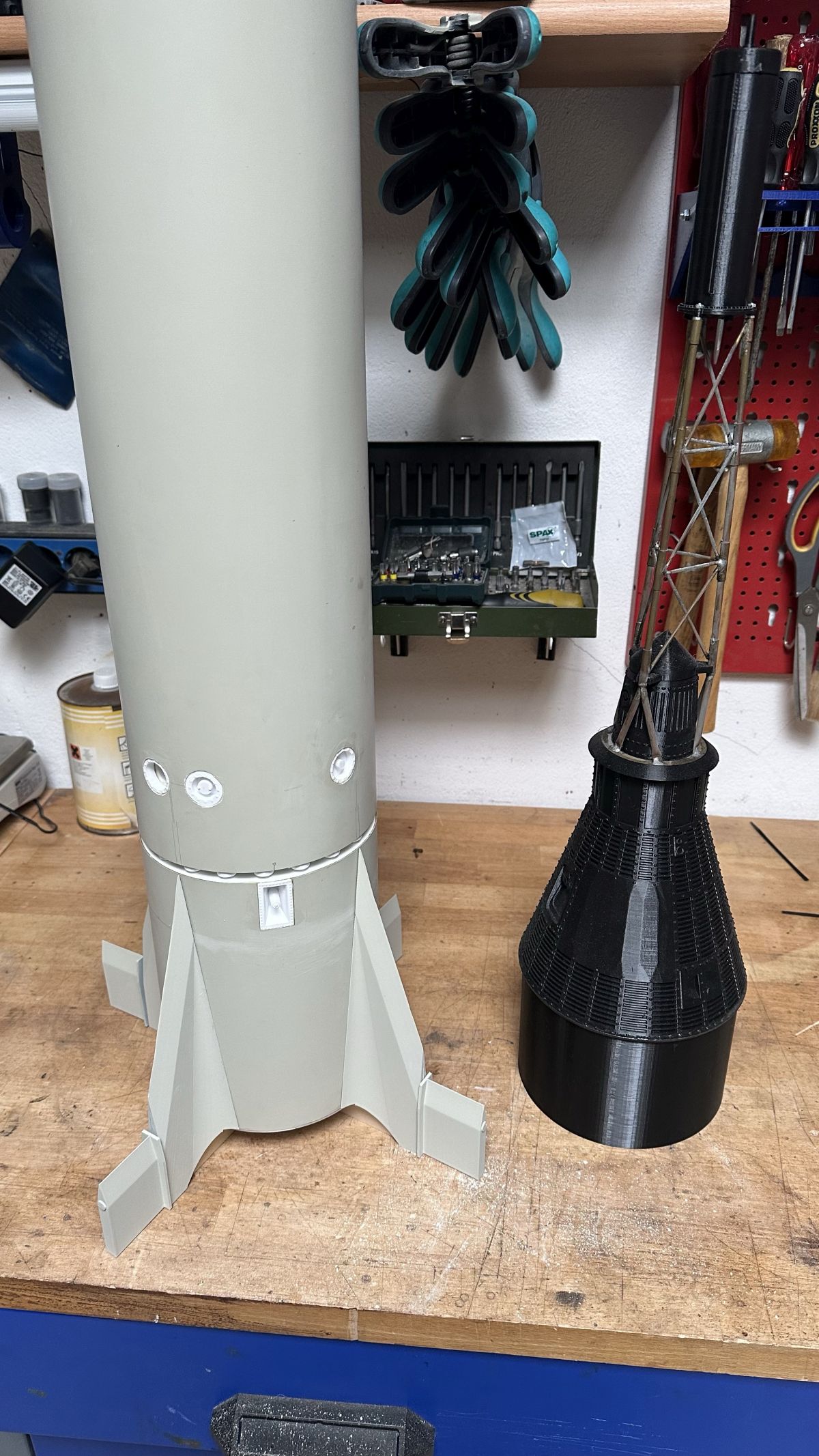 Darauf kommt ein Tower aus Messing, und ganz vielleicht ein echter Rettungsmotor, der den Turm dann im Flug wegzieht, wie beim Original. Da muss ich aber noch Tests machen ob das klappt.