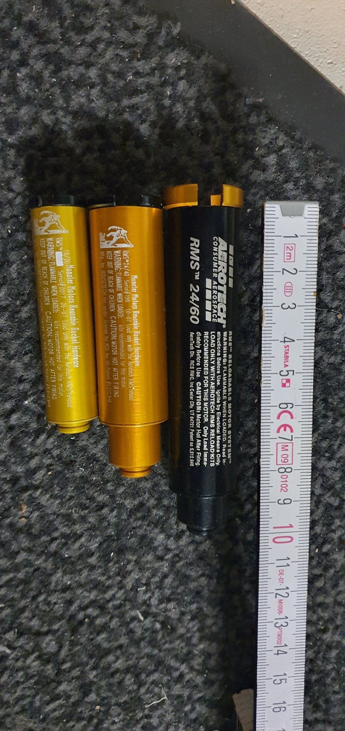 Bei Aerotech 24/40 und 24/60 sind die Casings nicht nur unterschiedlich lang, sondern auch die Schubringe ("rear closure") sind unterschiedlich fett. Den kleinen 24/40er kann man auch gut in einen Estes-Adapter 24/29 legen, der 24/60 passt da nicht mehr rein. Die "gängigen Größen" sind übrigens 24 x 70 mm (Estes D12, RMS 24/40) und 24 x 95 mm (Estes E9, E12, RMS 24/60). (Cesaroni 24mm Casings sind länger, aber sowieso alle in P2!) Bei Bedarf mache ich gerne ein paar Fotos davon. Ich fliege überwiegend in dieser Klasse, und habe mich erst neulich über den Adapter 24/29 gefreut - er hat den Schubring mit dran und ermöglicht es so, alle denkbaren Motoren in ein 29er Rohr einzubauen. Die neuere Estes Saturn V oder Saturn V Skylab hat einen 29er Mount mit Schraub-Retainer. Gute Sache! Aber lass Dich in erster Linie davon leiten, welche Motoren Du fliegen willst! Reload oder Single-Use? Aerotech E und F Motoren sind jetzt als P1 erhältlich, also freie Auswahl! Brauchst Du einen Überblick über die Motortypen? Mit Erklärung? Und die Preise sind vllt. auch ein Kriterium. RMS24/40 unter 20 Gramm NEM: D9W, D15T, E28T! (Luft VO!) 24mm Single-Use (SU) unter 20 Gramm: E20W, E30T. RMS 24/40 über 20 Gramm: E11J, E18W, F24W, F39T. Hier haben die F-Motoren 50 Newtonsekunden. Fast 60 Ns gibt es im Casing 24/60: F35W, F51NT, F63R Und dann gibt es noch F mit 80 Ns im Casing 29/40-120 ...