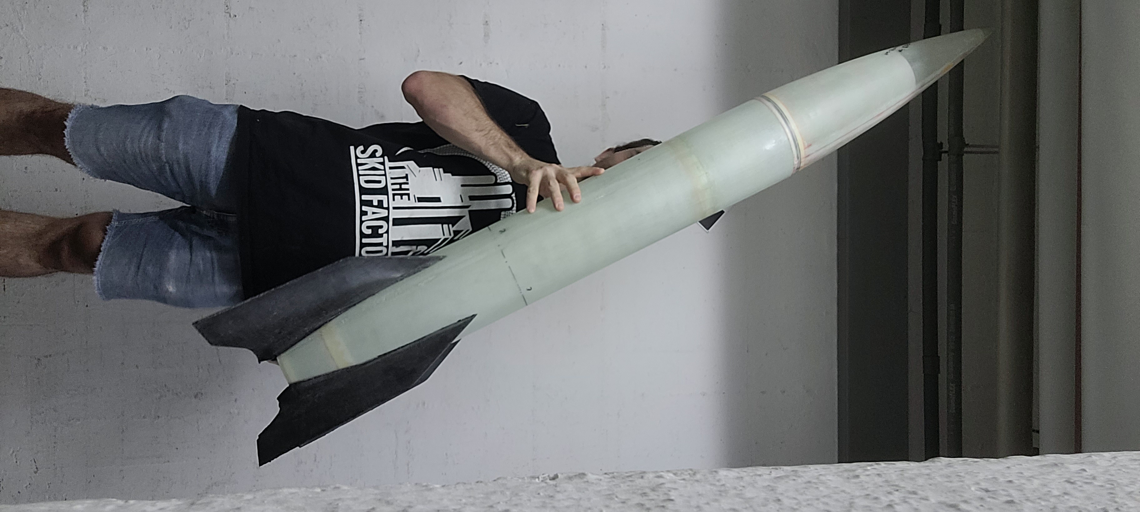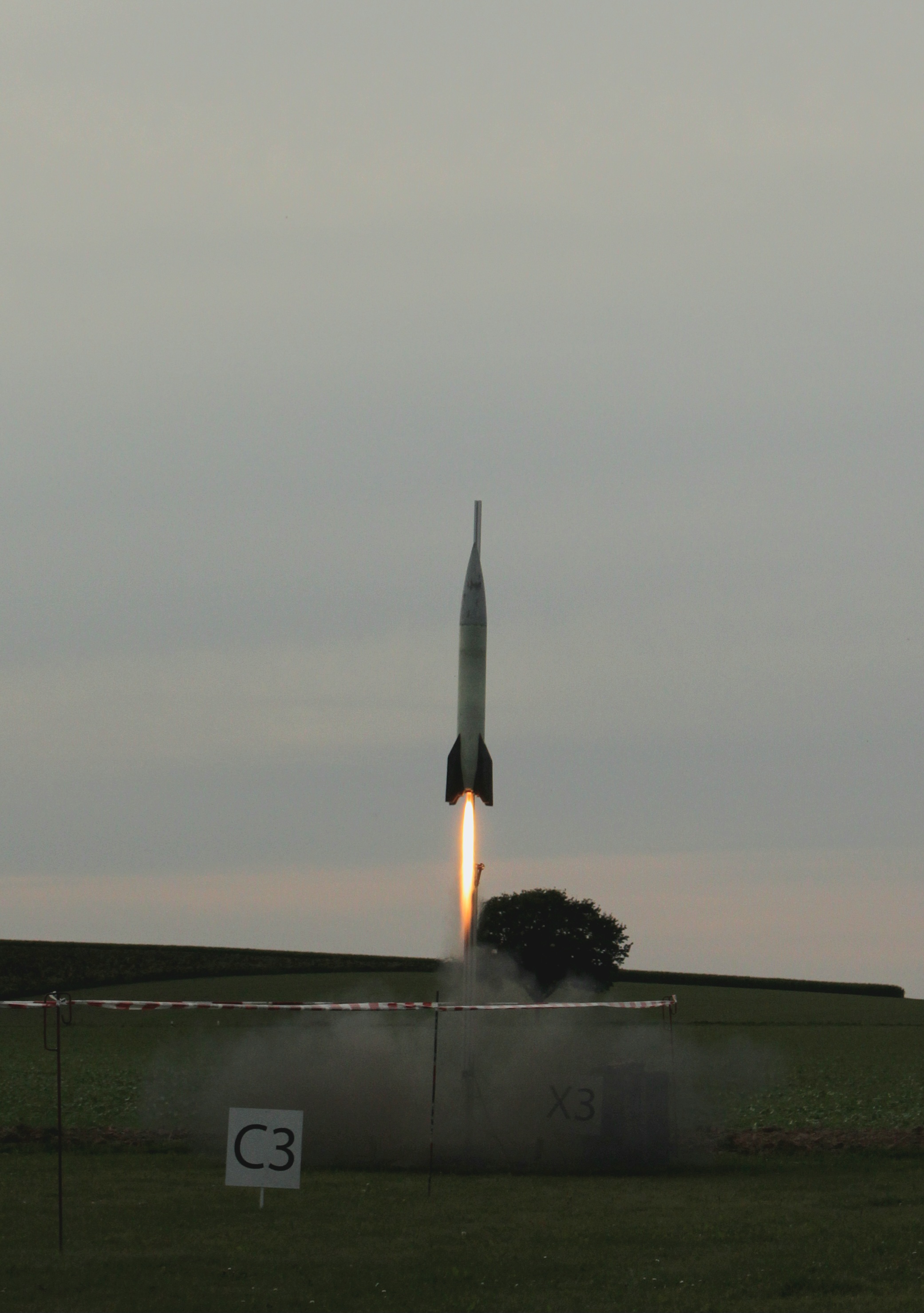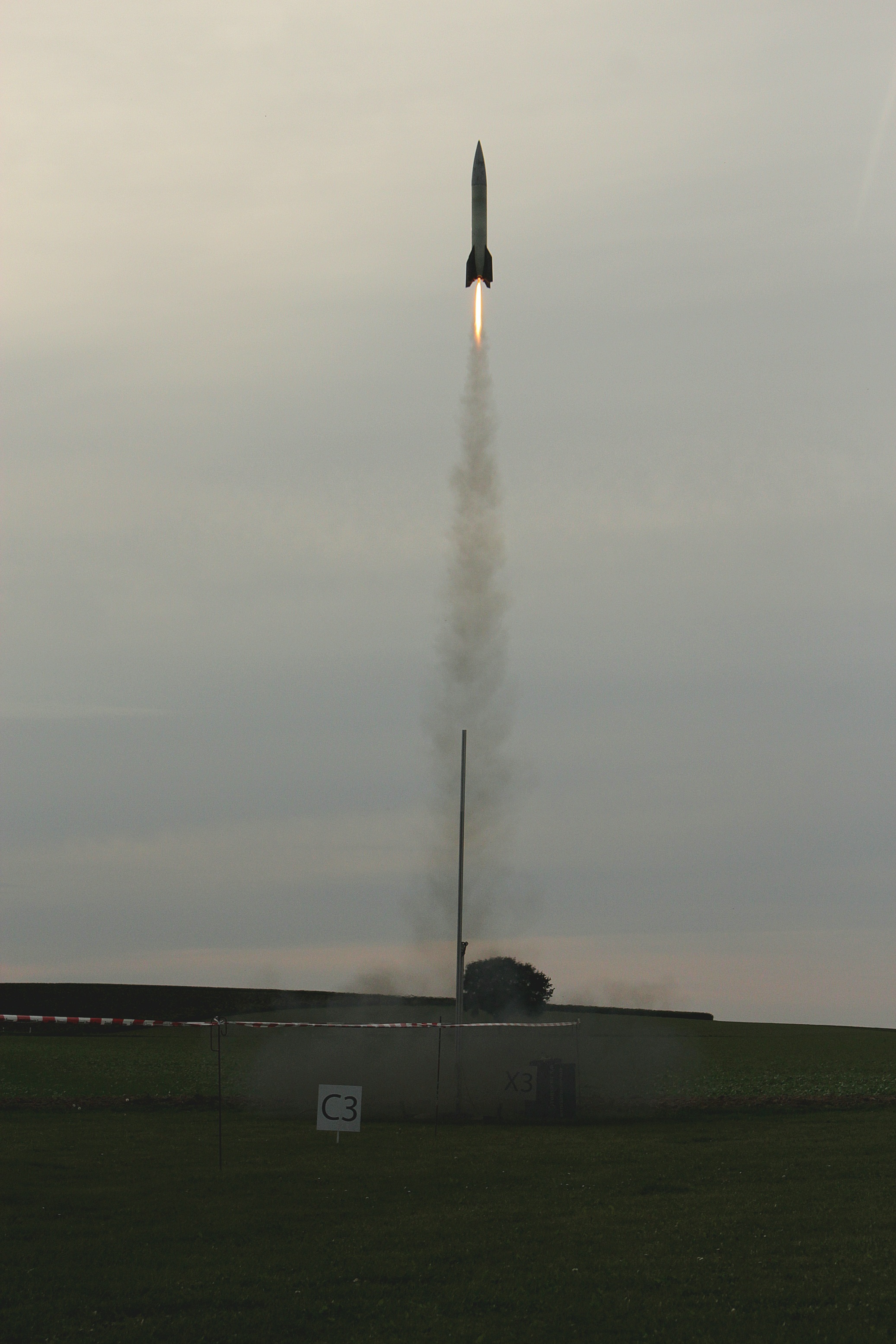 Der Erstflug fand am 6.09. beim RMV Experimental- und Scale-Wettbewerb statt und erreichte mit ~650Ns knapp 370m Flughöhe. Eigentlich hätte es über 400m gehen sollen, aber der Vorschirm würde zu früh ausgeworfen, dazu später mehr. Hier ein paar Screenshots aus den Videos die ich bekommen habe: Und frisch geborgen Keine Woche später gab es dann die nächste Gelegenheit für Flüge beim Solaris-Flugtag in Straubing. Zunächst mit der gleichen Motorisierung, diesmal mit Auswurf am Gipfelpunkt und nicht davor (407m): Der Vorschirm hatte sich in seinem Schutztuch verwurstelt (ja das ist ein Wort) und wollte nicht aufgehen. Bei serieller Zweistufenbergung nicht ganz ideal, aber der Hauptschirm kam trotzdem wie geplant, da in der Rakete genug Platz ist und alles lose gepackt werden kann. Nach zwei Flügen nahe am Original (Flüssig-Flüssig-Antrieb) folgte noch einer auf Hybrid (mehr dazu hier! ). Knapp 800Ns beförderten sie auf 550m: Nächster Halt: Lackierung... 'Technisch gesehen hat alles funktioniert!' -Ich (oft kopiert) |