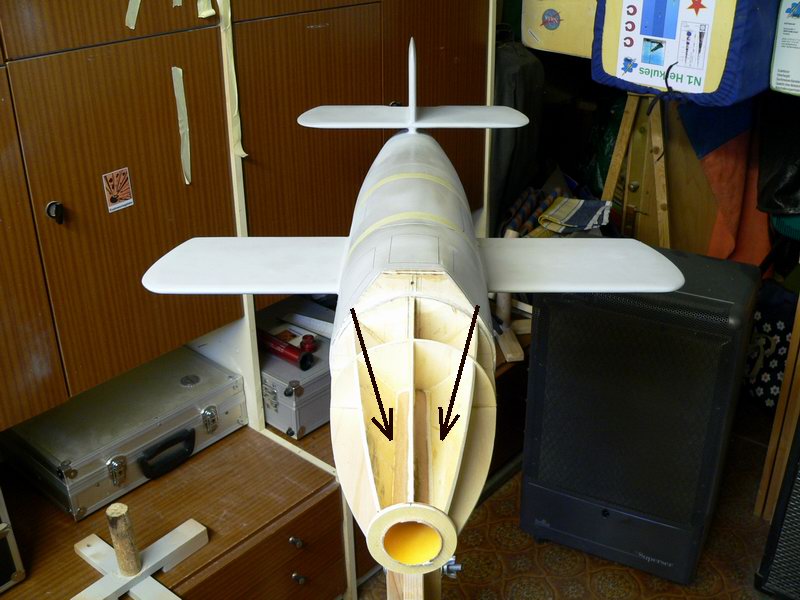 Morgen Vormittag ist Bleigießen angesagt. Da werde ich Bleibarren gießen, welche exakt in die Fächer (Pfeile auf dem Bild) reinpassen sollen. Damit liegt dann die schwerste Masse in der Motorschublinie. Ich denke, dass ich da einen guten Weg gefunden habe. Erreichen will ich außerdem, dass der SP noch bis vor den Flügeln wandert. Folgende Datei wurde angehängt:
