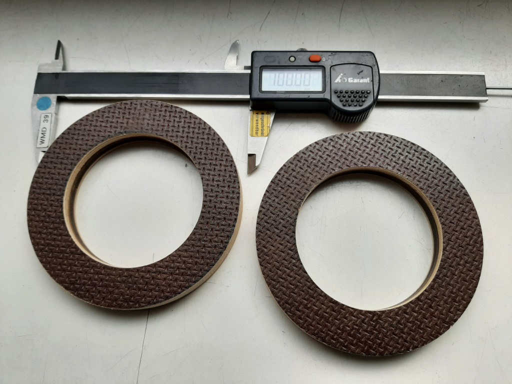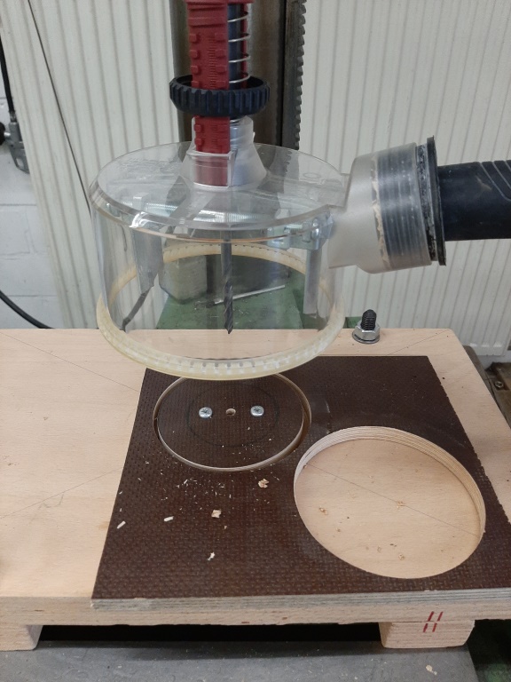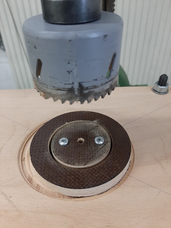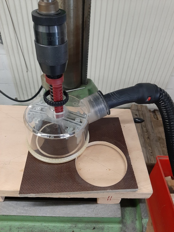 Heute war die Herstellung des Schubspantes dran. Siggis Motor hat ja an der Düsenseite keinen Schubring sondern ist durchgängig glatt, er drückt also am oberen Ende gegen den Schubspant und leitet so die ganze Energie in die Struktur der Rakete ein, um mit der IKARUS aber auch die Langen Hybridmotoren fliegen zu können hat er in der Mitte eine 60mm Öffnung wo die 54er Hybridmotoren durch passen... Die Herstellung erfolgte wieder auf die altmodische Art und Weise mir Kreisschneider und Lochkreissäge. Material ist eine 15mm Siebdruckplatte.