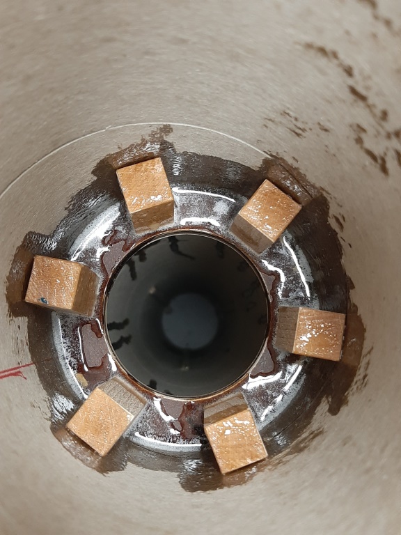 Der Schubspant wurde eingeharzt. Die Holzklötzchen sind zusätzlich noch seitlich durch das Körperrohr verschraubt. Und der verstärkte Kuppler vom Mittelrohr sitzt direkt auf den Klötzchen auf und wird dann ebenfalls mit dem Booster verschraubt...  !