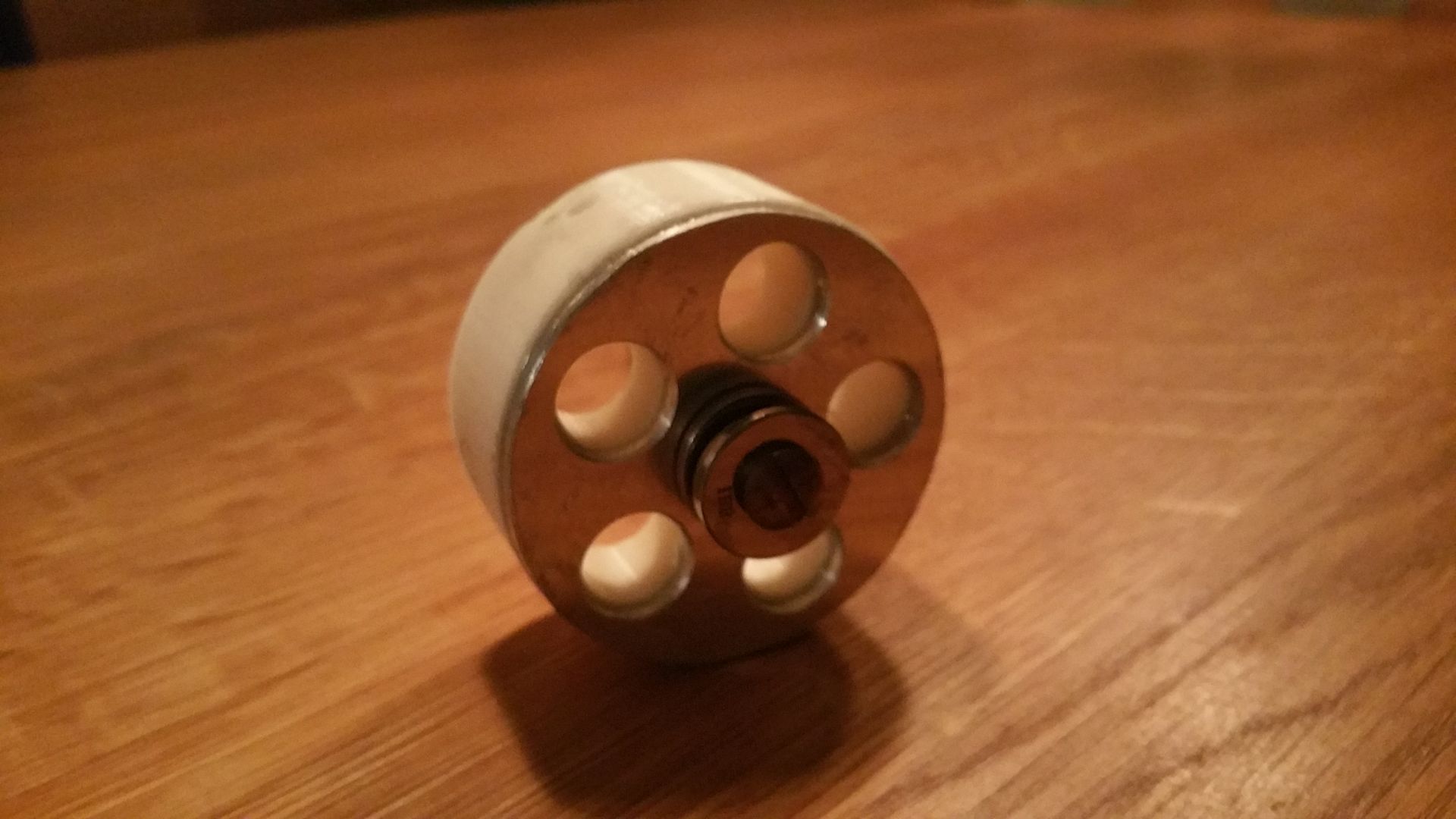 Die Shockcordverankerung sieht jetzt so aus. Ich habe mich dann doch für einen Materialmix entschieden, da ich keine Lust hatte das ganze aus dem Vollen zu fräsen. die Aluplatte kann die Kraftspitzen gleichmäßig aufnehmen. Das Radial-lager ist darunter versteckt.