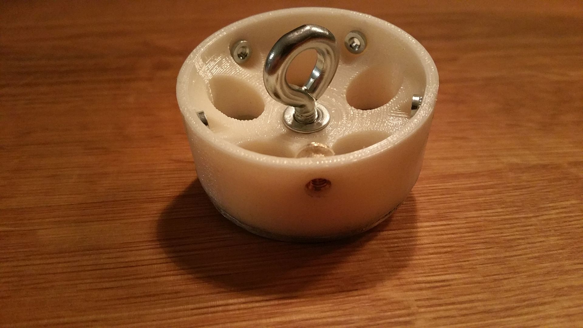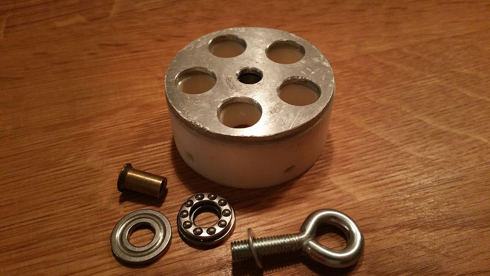 Damit die Shockcord nicht Verdrallen kann, habe ich diese Desing Studie entworfen. Aus einem Axial und einem Radiallager plus der noch fehlenden Ringschraube. Die Achse dreht sich jetzt im Trockentest butter weich. Woraus ich den Bulkhead baue weiß ich noch nicht. Der 3D Druck wird das wohl nicht halten.