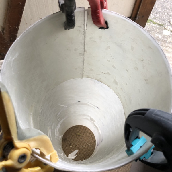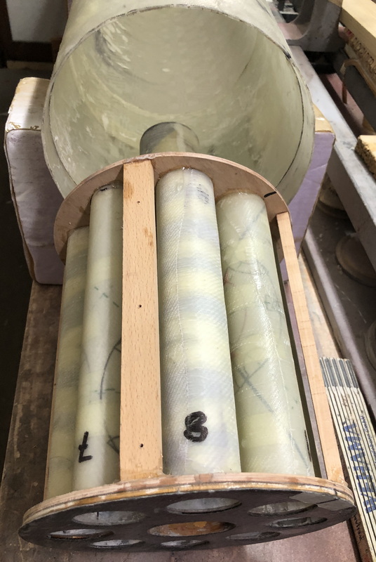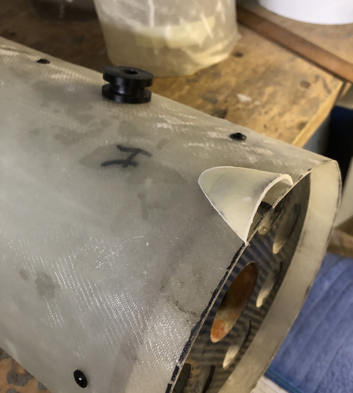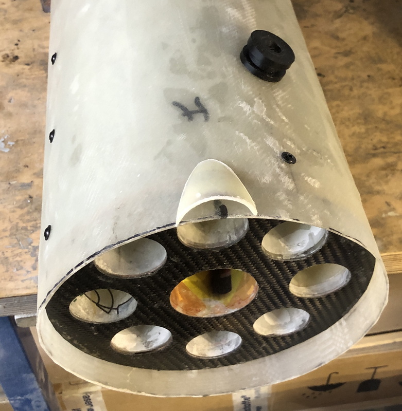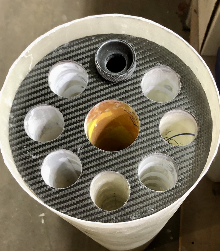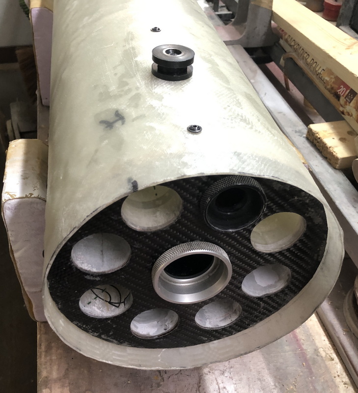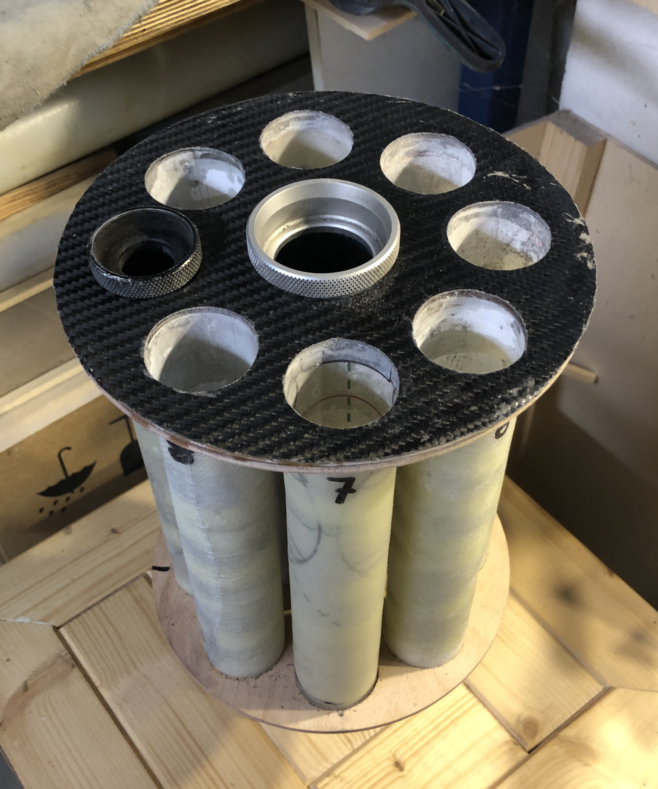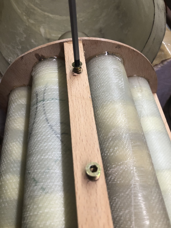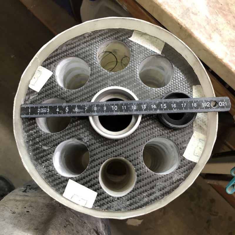 Ich würde ihn aber nicht fest ins Körperrohr einkleben sondern wechselbar ausführen! Genau das habe ich vor, aber nicht wegen eines anderen Motors, sondern weil ich bei dem fest eingeklebten Clusterbocks nicht mehr von innen an das Körperrohr komme. Und ich will von innen die vier großen Chime mit integrierten, durchsichtigen Acrylflügeln anschrauben. So kann man sie gegebenen Falls auswechseln. So, der Block sitzt schon mal.