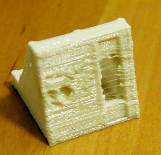 Außerdem habe ich die Zuführung des Filaments etwas verbessert, er verliert jetzt auch keine Schritte mehr. Beim Probedruck eines einfachen Quaders habe ich zuerst vermutet, dass nicht genug Material extrudiert wird, dann war es plötzlich zuviel und wurde verschmiert. Das Problem war schlussendlich, dass die Platte nicht komplett eben ist, sondern in der Mitte, wo man meistens druckt, 0,2 bis 0,3 mm über "Normal Null" liegt. Daher müssen die Z-Koordinaten entsprechend angepasst werden. Am Schluss war ich aber halbwegs zufrieden mit meinem Probedruck und dachte mir, folgendes Teil könnte man mal probedrucken: Es handelt sich hierbei um eine Halterung, die auf einem Brett festgeschraubt wird, und in dem ein Schiebeschalter und eine Status-LED für den Dentamag montiert werden sollen. Hier sieht man die ersten paar Ebenen. Zunächst wird eine Umrandung gedruckt, hier erkennt man durch die Tröpfchenbildung, dass die Extruderdüse offenbar doch etwas zu weit von der Baufläche entfernt ist. Das legt sich aber mit den weiteren Ebenen, wie man ja am Teil selbst erkennen kann. Im nächsten Bild sind schon die Aussparungen für den Schiebeschalter zu erkennen. Der weitere Druck verlief zunächst unspektakulär, aber wie Ihr Euch vielleicht denken könnte, ist der obere Abschluss der Öffnung für den Schiebeschalter nicht ganz einfach, und auch das Loch für die LED könnte sauberer sein. Naja, wegdremeln kann man immer noch. Dann müssen auch die ganzen spinnwebenartigen Fäden dran glauben. Hier seht Ihr die Unterseite des Teils. Die Lücken stammen wie schon bei der Umrandung von dem zu großen Abstand zur Baufläche. Normalerweise ist die Unterseite eines gedruckten Teils spiegelglatt (oder zumindest so glatt wie die Baufläche). Die Vorderseite des Teils ist deutlich zerklüfteter, es sieht auf dem Bild aber auch deutlich schlimmer aus als es ist. Nacharbeit erfordert auf jeden Fall das Loch für die LED, die Öffnung für den Schiebeschalter ist bis auf die Spinnweben eigentlich ganz gut geworden. Ein Blick hinter die Kulissen zeigt noch deutlich mehr Spinnweben, das ist aber unkritisch. Die Trichter für die Senkkopfschrauben sind auch gut zu erkennen, hier zeigt sich dann auch sehr gut, wie maßhaltig so ein Druck ist. Dafür habe ich mir aber schon andere Probedruckteile ausgedacht, v.a. was das Einpressen von Muttern angeht. So, erstmal bin ich recht zufrieden, zumal ich auch nicht genau weiß, an welchen Stellschrauben ich jetzt noch drehen muss, um ein besseres Ergebnis zu bekommen. Aber nächsten Donnerstag ist wieder 3D-Druck-Abend im Hackerspace Bremen, vielleicht schaffe ich es da vorbeizuschauen. Oliver |
