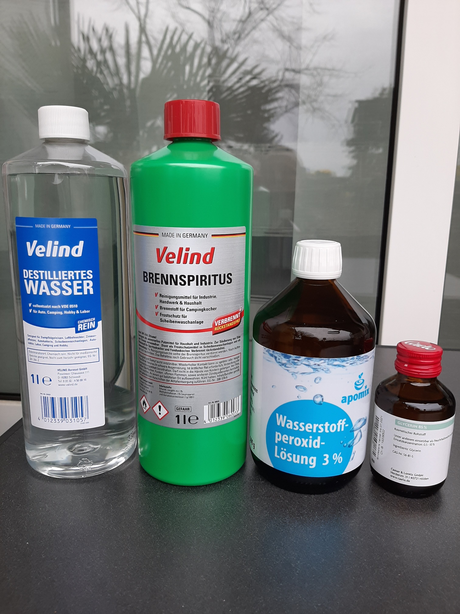 Zitat: Ich habe heute (20.03.2020 17:00 Uhr) noch problemlos die von der WHO empfohlenen Grundstoffe zur eigenen Herstellung eines wirksamen Desinfektionsmittels in unserer Apotheke und Drogerie kaufen können... 1. Ethanol (Spiritus) 2. destilliertes Wasser (abgekochtes Wasser geht natürlich auch) 3. 3 %ige Wasserstoffperoxyd Lösung, 4. Glycerin (85%) Andreas Geändert von Andreas B. am 20. März 2020 um 20:45 |